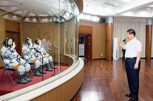 習(xí)近平來(lái)到航天員公寓問(wèn)天閣,為即將出征的神舟十號(hào)航天員壯行。習(xí)近平說(shuō),你們執(zhí)行我國(guó)第五次載人航天飛行任務(wù),承載著中華民族的航天夢(mèng),展現(xiàn)了中國(guó)人“敢上九天攬?jiān)隆钡暮狼閴阎?。預(yù)祝你們成功,期待你們凱旋。