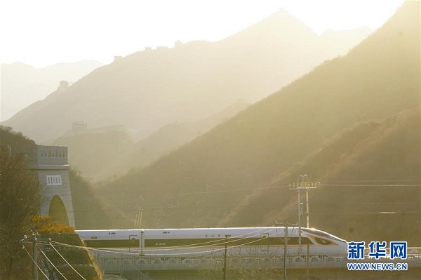 2019年12月30日,G2418次列車(chē)駛過(guò)居庸關(guān)長(zhǎng)城。當(dāng)日,北京至張家口高速鐵路開(kāi)通運(yùn)營(yíng),崇禮鐵路同步通車(chē)。新華社記者 邢廣利 攝