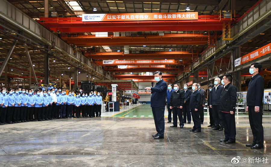 26日下午,正在廣西考察調(diào)研的習(xí)近平總書記來到廣西柳工集團有限公司,了解企業(yè)生產(chǎn)經(jīng)營和研發(fā)攻關(guān)等情況。習(xí)近平指出,高質(zhì)量發(fā)展是“十四五”時期我國經(jīng)濟發(fā)展的必由之路,裝備制造業(yè)高質(zhì)量發(fā)展更是重中之重。他強調(diào),高質(zhì)量發(fā)展,創(chuàng)新很重要,只有創(chuàng)新才能自強、才能爭先,在自主創(chuàng)新的道路上要堅定不移、再接再厲、更上層樓。(文字記者:張曉松、朱基釵;攝影記者:鞠鵬、謝環(huán)馳)