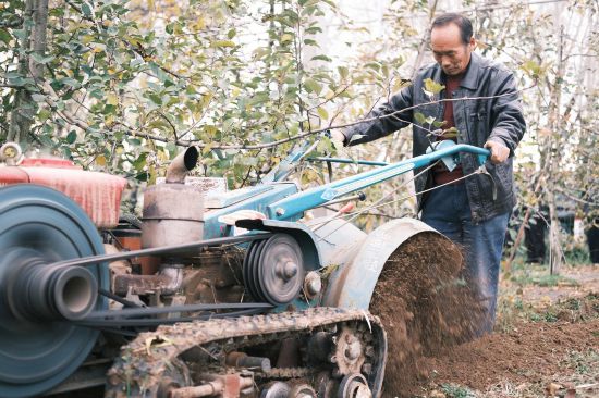 村民李育宏在蘋果園里用開溝機開溝。人民網(wǎng)記者 吳超攝