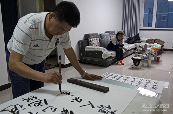 晚飯后“父女倆”經(jīng)常一塊練書(shū)法。古麗念古詩(shī),姜亦生則邊聽(tīng)邊寫(xiě),希望潛移默化地提高“女兒”的文學(xué)修養(yǎng)?!肮披惸阕罱胀ㄔ捤接兴陆的??!苯嗌χ鴮?duì)“女兒”說(shuō)。
