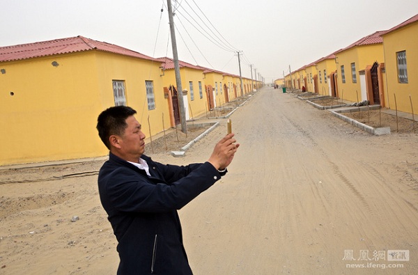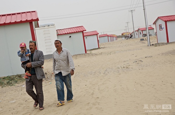 兩名新村村民抱著孩子走過(guò)沙漠上的蔬菜大棚。今年這個(gè)新村還將建成一座幼兒園,完善進(jìn)村公路及村內(nèi)的道路硬化、美化等。
