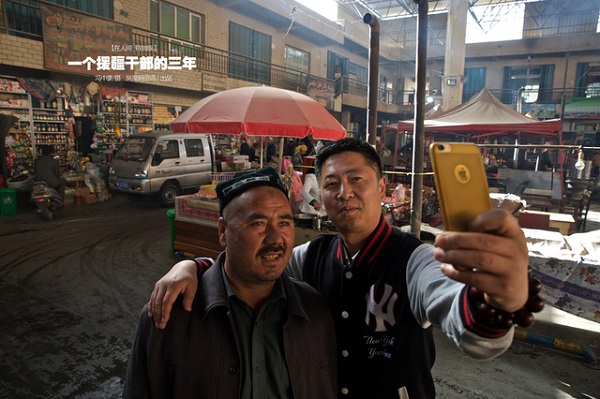 新疆和田,援疆干部——洛浦縣縣委副書(shū)記姜亦生在菜市場(chǎng)遇見(jiàn)一名維族同胞,熱情地?fù)е嫌傲裟?。今年是他從北京?lái)到南疆的第三年。 馮中豪/攝