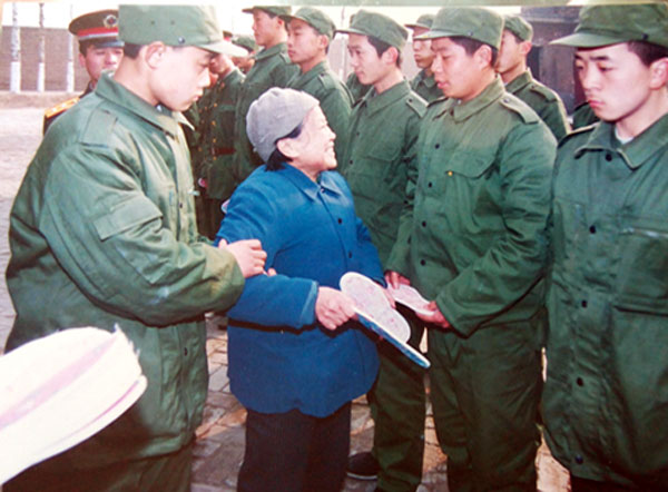 “那陣,老伴先后將兩個兒子送去參軍,我們當時經營不錯的餐館就沒人管了,我當時還想不通……”滿口河南話的王欽堂老人說起這些還有些不好意思。“俺覺悟低,通過老伴開導,俺也想通了。我有退休金,她有社保金,夠花就行了,而后一合計,關了飯店就開了一家鞋店……”老人回憶說,當時名字叫“豫新鞋店”,意思是記著河南新鄭的老家?!捌鸪踉诮洜I鞋店時,俺倆就很明確:決不能賺子弟兵的錢、凡軍人及其家屬購買時一律按最低價出售、子弟兵來買鞋時必須贈送鞋墊的三項原則。后來經人指點,直截了當就叫了‘擁軍鞋店’”。