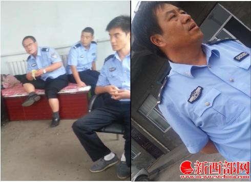 在停車(chē)場(chǎng)內(nèi)的辦公室門(mén)口,也停放著一輛警車(chē)(陜E1682警)。辦公室內(nèi),一位”交警“正忙著開(kāi)票收錢(qián),其余七八位“交警”懶散地倚靠在一張單人床邊,或吃東西或抽煙。