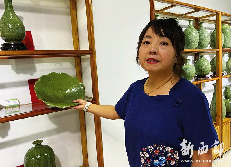 ▲耀州窯唐宋陶業(yè)有限公司藝術(shù)總監(jiān)梁亞萍向記者介紹陶瓷創(chuàng)新技藝