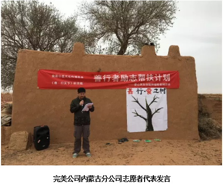 日前,由完美公益文化傳播基金、旅游衛(wèi)視《善行天下》欄目組等聯(lián)合舉辦的“善行者勵志幫扶計劃”正式啟動,內(nèi)蒙古阿拉善作為第一站完美收官,完美(中國)有限公司北京辦事處、內(nèi)蒙古分公司志愿者代表參加了此次活動。