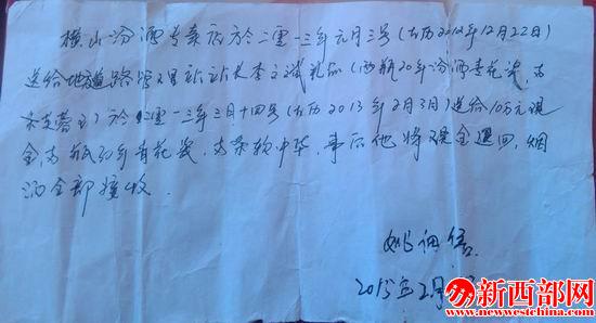 “自古以來,欠債還錢,天經(jīng)地義,為啥地道站的相關(guān)人員就不付賬呢?”說著當(dāng)事人又拿出一張紙條,這是一張向該縣地道站站長李融斌送禮的條子。顯示,2013年元月3日、2013年3月14日分兩次向地道站李站長送禮20年汾酒青花瓷、芙蓉王、軟中華等,價值3000多元。