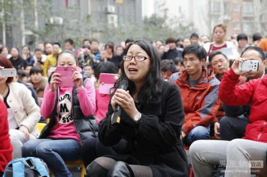 圖為一名家長在溝通會(huì)上哭訴孩子服藥后腿痛不想上學(xué),自己時(shí)常責(zé)怪孩子?jì)蓺猓医杩谕祽小?/p>