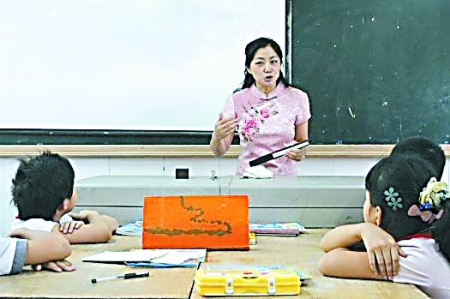 日前,記者在大渡口百花小學(xué)見到了夏子莉,她正準(zhǔn)備用評(píng)書的方式來教學(xué)生求圓錐體積。