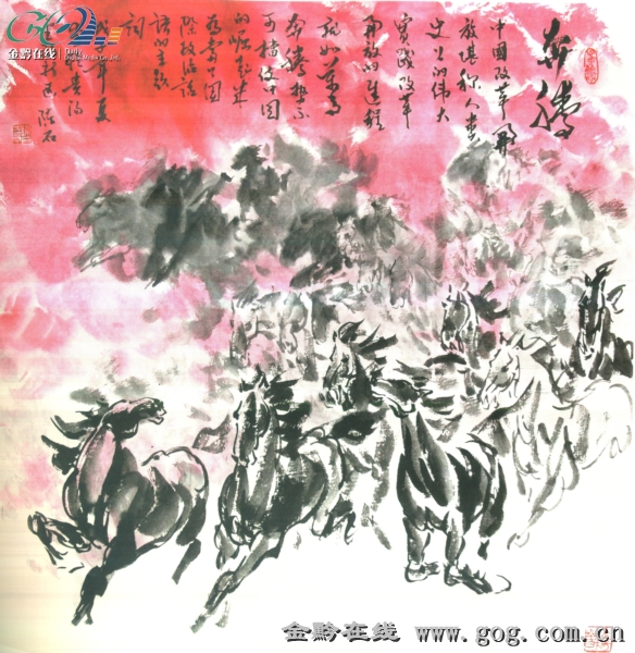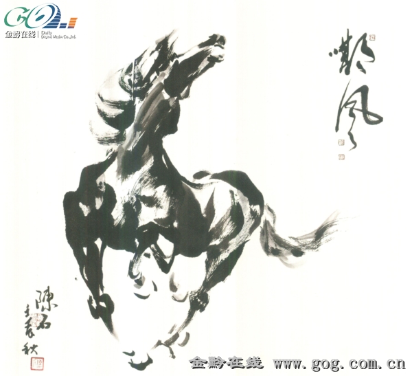 陳石的畫筆下描繪了大量的山水、人物,尤其是陳石畫的馬,形態(tài)萬(wàn)千出神入化,《奔馬》、《奮蹄》、《馳騁》、《汗馬嘶風(fēng)》等風(fēng)趨電疾的神駿氣吞萬(wàn)里;《凝目》、《思念》、《春風(fēng)》、《秋原》等畫作中的良驥從容徜徉,平和恬靜。動(dòng)中有和諧韻律,靜處有意境幽深。動(dòng)靜皆宜,各有異趣。文中這樣評(píng)價(jià),陳石以“馬”為主題的系列作品,運(yùn)用中國(guó)水墨為主要表現(xiàn)手段,參用了西方的透視法,構(gòu)圖大膽合理,用筆剛健有力,勾勒準(zhǔn)確生動(dòng),潑墨酣暢淋漓,是新時(shí)代新時(shí)期的馬。