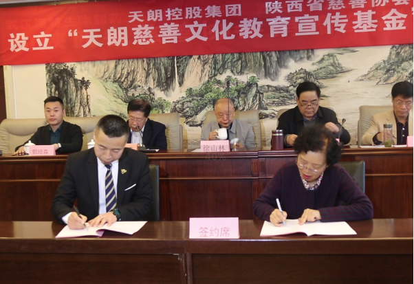 天朗控股集團(tuán)副總裁周崗與省慈善協(xié)會副會長張鳳英簽訂了“天朗慈善文化教育宣傳基金”協(xié)議。該基金為“留本捐息”冠名慈善基金,天朗控股集團(tuán)設(shè)立本金為人民幣2000萬元每年按基金總額5%提取增值款,即人民幣100萬元捐贈給省慈善協(xié)會,專項用于支持慈善書畫展等慈善文化教育宣傳項目的開展,其中50萬元用于支持《善天下》雜志辦刊。