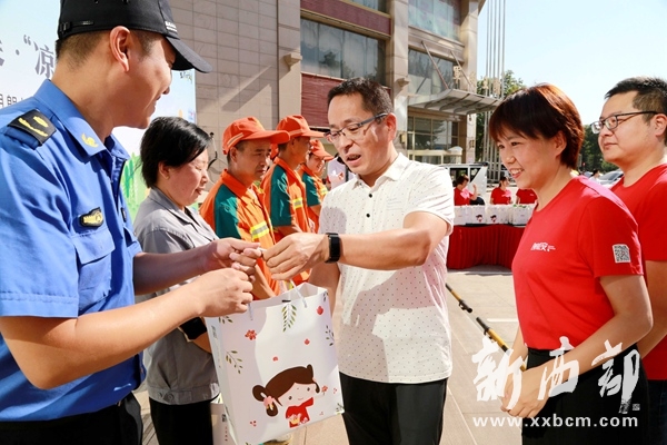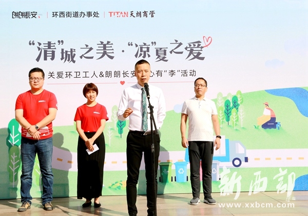為貫徹西安市垃圾分類的管理要求,倡導(dǎo)大家從自己做起,從身邊的小事做起,積極主動開展垃圾分類,愛護(hù)城市環(huán)境,同時也讓更多的人理解城市“美容師”工作的艱辛不易,感謝城市“美容師”的默默奉獻(xiàn),8月16日,朗朗長安、西安環(huán)西街道辦事處、天朗商管公司在天朗蔚藍(lán)機電廣場攜手舉辦 “清”城之美?“涼”夏之愛”——關(guān)愛環(huán)衛(wèi)工人&朗朗長安愛心有“李”活動,蓮湖區(qū)環(huán)西街道辦事處主任嚴(yán)平顯、蓮湖區(qū)環(huán)西街道武裝部部長雷雨、天朗控股集團副總裁周崗、朗朗長安負(fù)責(zé)人張倩、天朗控股集團品牌總監(jiān)張楠、朗朗長安CO團隊,以及環(huán)衛(wèi)工人、保潔員、城市管理執(zhí)法人員等一同參加本次活動,并為城市的環(huán)衛(wèi)工人送上一份夏日的清涼與愛心。