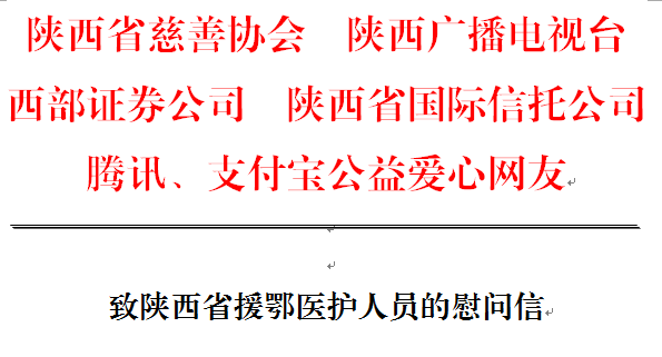 在湖北武漢新冠疫情爆發(fā)的關(guān)鍵時刻,你們響應(yīng)黨的號召,挺身而出、逆行而上,擔(dān)負(fù)起國家的使命、肩負(fù)著3800萬三秦兒女的深情,義無反顧奔赴荊楚大地,英勇奮戰(zhàn)在抗疫最前線,用自己的生命守護(hù)著人民群眾的生命安全和身體健康。在此,陜西省慈善協(xié)會、陜西廣播電視臺、西部證券公司、陜西省國際信托公司、騰訊、支付寶公益愛心網(wǎng)友向你們致以崇高的敬意、誠摯的慰問和衷心的感謝!