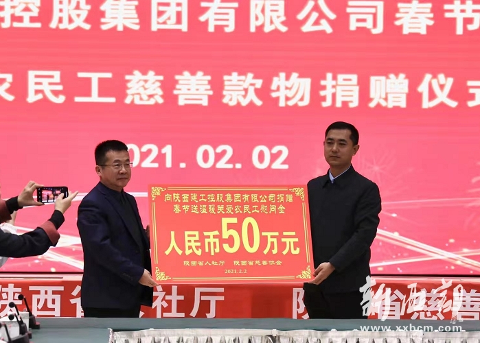 ▲陜西省慈善協(xié)會(huì)、省人社廳向陜西建工控股集團(tuán)捐贈(zèng)關(guān)愛(ài)農(nóng)民工款物儀式在西安舉行。