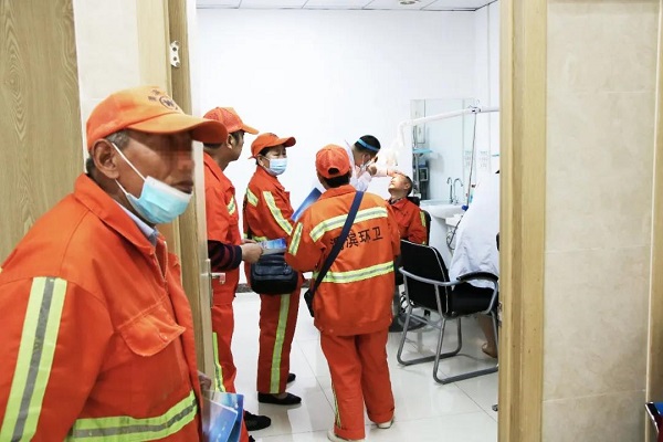 醫(yī)生為排隊的環(huán)衛(wèi)工人簡單介紹體檢項目