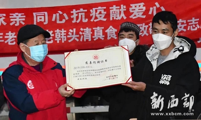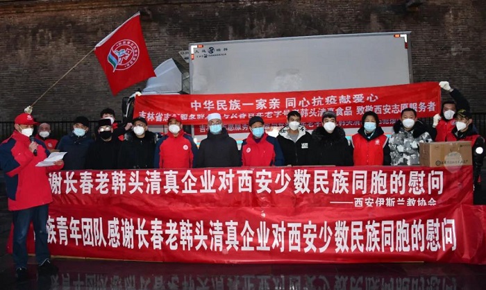 定紀(jì)平說(shuō),去年疫情突襲,身在回坊的醫(yī)護(hù)工作者、公安干警、社區(qū)工作者等一線抗疫人員,紛紛為抗疫貢獻(xiàn)出自己的一份力量,踐行著責(zé)任與擔(dān)當(dāng)。今天,“老韓頭食品”為西安的少數(shù)民族同胞們送來(lái)了寒冬中的溫暖,在此,我們向長(zhǎng)春老韓頭清真食品有限公司、西安市慈善會(huì)及為疫情防控做出一定貢獻(xiàn)的“民族青年支援團(tuán)”表示衷心的感謝。
