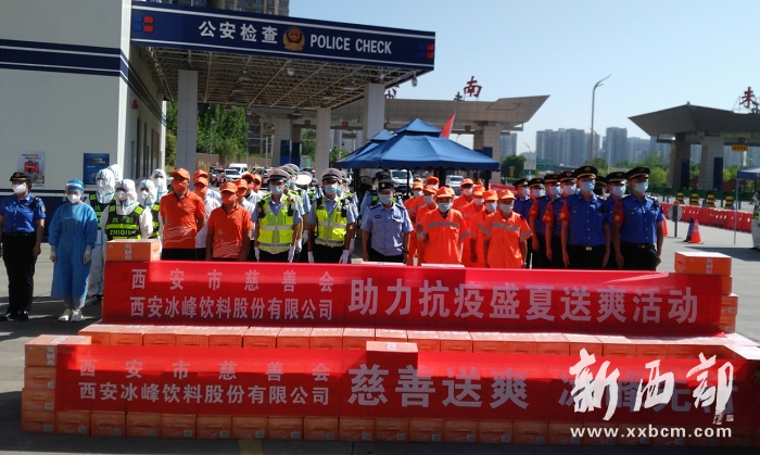本次活動共籌集價值16余萬元的冰峰飲品2100箱。從未央?yún)^(qū)未央南收費站至雁塔區(qū)電視塔,共9個站點,沿途對一線環(huán)衛(wèi)工人、交通警察進行慰問。