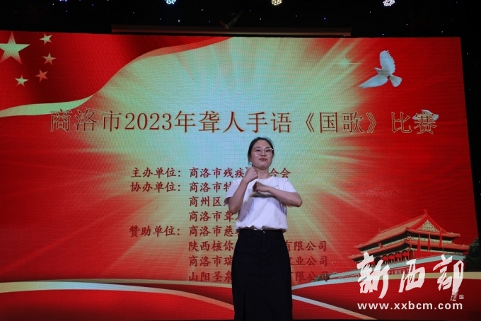 比賽中,參賽選手們伴隨著《國(guó)歌》鏗鏘有力的旋律,口手并用、聲情并茂,用莊嚴(yán)、激昂的手語(yǔ)展示了殘疾人自尊、自信、自立、自強(qiáng)的生活信念以及自己對(duì)祖國(guó)的熱愛(ài)之情。
