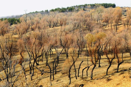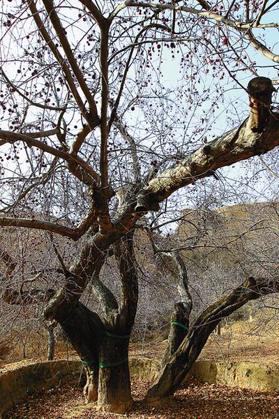 府谷縣海紅果“樹(shù)王”就生長(zhǎng)在王家梁村,據(jù)說(shuō)已經(jīng)有200多年樹(shù)齡。在村民的指引下,記者見(jiàn)到了這棵飽經(jīng)滄桑的樹(shù)。只見(jiàn)此樹(shù)高十余米,生長(zhǎng)在一個(gè)溝槽平地中,主干大部分淤在地里,裸露部分直徑約2米,向上分為4個(gè)枝,各枝直徑又有半米左右。
