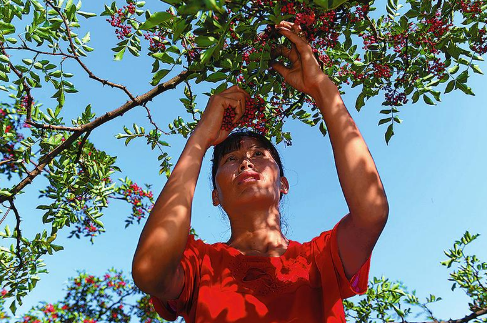 離開延河入黃處,順著黃河向下游行走不久,就到了涼水岸村村民的花椒園。紅色的花椒掛滿了枝頭,遠(yuǎn)遠(yuǎn)看去,就像綠色的緞子繡上了紅色的花朵,好看極了。走進(jìn)花椒園,記者遇到了正和家人采摘花椒的椒農(nóng)王群洋??粗活w顆紅寶石般的花椒從樹上落入筐中,王群洋和妻子仿佛看到了富裕的生活,臉上掛滿了笑容。
