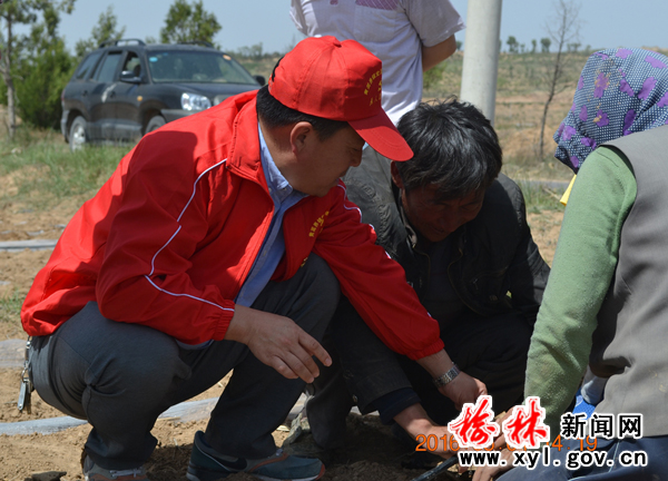 該鎮(zhèn)黨員干部指導(dǎo)農(nóng)民使用滴灌新技術(shù)。