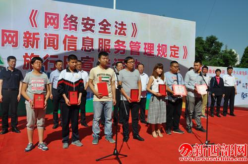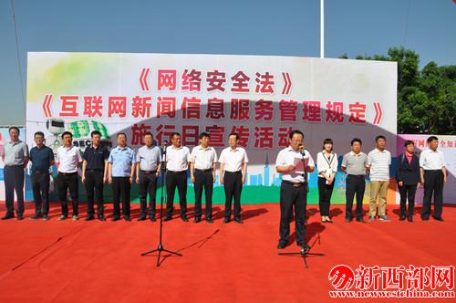新西部網(wǎng)榆林訊(記者王永程見習(xí)記者李佳奕)為普及網(wǎng)絡(luò)安全知識,規(guī)范互聯(lián)網(wǎng)新聞信息管理,6月1日上午,由市委宣傳部、市委網(wǎng)信辦、市司法局和市公安局共同舉辦的《互聯(lián)網(wǎng)新聞信息服務(wù)管理規(guī)定》施行日宣傳活動在世紀(jì)廣場舉行。市委常委宣傳部長李博、市政協(xié)副主席、市司法局局長蘇世強、市委副秘書長陳志忠等領(lǐng)導(dǎo)出席。市委宣傳部常務(wù)副部長、市網(wǎng)信辦主任康愛軍主持。