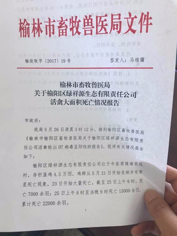 華商報記者在該文件上看到,該公司位于牛家梁鎮(zhèn),存欄雞蛋有4.5萬羽,雞群從5月21日開始發(fā)病并有零星死亡現象,23日開始大量死亡,截止25日上午8時,死亡7000余羽;25日上午8時至當晚9時死亡1500余羽,累計死亡22000余羽。同時,榆林市動物疫病預防控制中心實驗室對送檢的樣品進行了監(jiān)測。