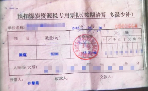 票據(jù)顯示:預(yù)扣煤炭資源稅為 15元/噸