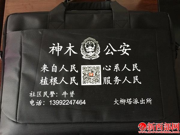 大柳塔派出所社區(qū)民警牛赟專門將個人微信二維碼印在包上方便群眾聯(lián)系