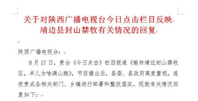 8月17日《今日點(diǎn)擊》欄目在電視播出平臺(tái)和新媒體渠道,同步播發(fā)了靖邊縣封山禁牧、禁而不止的相關(guān)情況,節(jié)目播出后靖邊縣委、縣政府連夜責(zé)成各相關(guān)部門、鄉(xiāng)鎮(zhèn)進(jìn)行部署和整改落實(shí),并向本欄目發(fā)來了回復(fù)函。