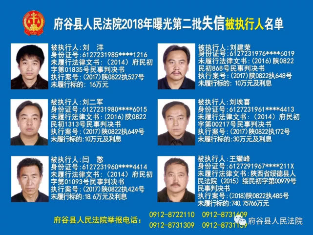 為督促被執(zhí)行人自覺履行生效法律文書所確定的義務(wù),切實(shí)保障債權(quán)人的合法權(quán)益,現(xiàn)將府谷縣人民法院執(zhí)行案件的部分失信被執(zhí)行人名單予以曝光。在此,本院鄭重告誡有履行能力的被執(zhí)行人,放棄僥幸心理,主動(dòng)履行義務(wù)。對(duì)于有償還能力拒不償還,對(duì)抗、逃避執(zhí)行,轉(zhuǎn)移、隱匿財(cái)產(chǎn)的被執(zhí)行人,本院將采取嚴(yán)厲的執(zhí)行和制裁措施。