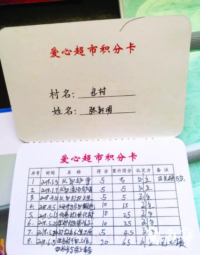 良村村委會(huì)主任孔根虎介紹說,鉗二社區(qū)便民服務(wù)中心統(tǒng)一設(shè)計(jì)制作的愛心超市積分卡類似于存折,群眾可以自己保存,也可以存放到愛心超市。根據(jù)規(guī)定,積分卡每積一分抵一元現(xiàn)金,每月至少開展一次評(píng)分活動(dòng),積分可累計(jì),不可兌換現(xiàn)金,年底必須將兌換物資發(fā)放完畢。群眾自愿參加力所能及的公益活動(dòng)或?yàn)槊撠毠?jiān)工作做出一定貢獻(xiàn)的均獎(jiǎng)勵(lì)一定分值。每個(gè)村(社區(qū))按月兌換,并留存兌換影像資料。村上對(duì)當(dāng)月積分情況予以張榜公示。