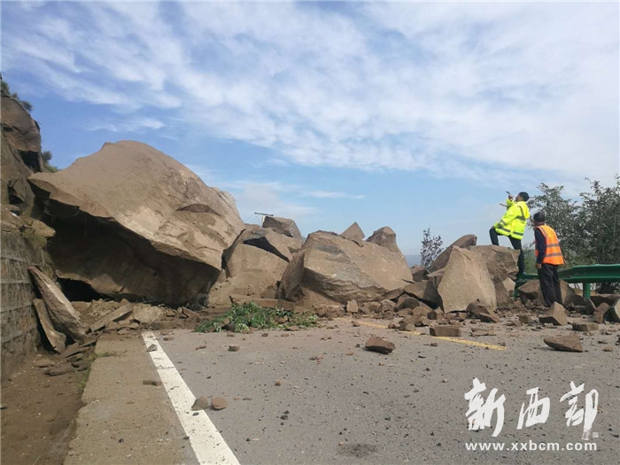 8月25日下午6時(shí)半,受連日來強(qiáng)降雨影響,神木公路段所轄養(yǎng)的省道S201沿黃觀光路馬鎮(zhèn)鎮(zhèn)申家溝村K114+700-K114+800高危邊坡路段突發(fā)大面積石塌方,部分落石重約三四噸,預(yù)測方量約為3200m3,塌方占據(jù)路面,致使該路通行受阻,存在較大的安全隱患。