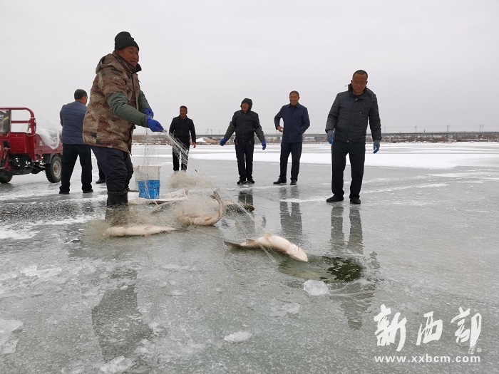 在零下20度的氣溫下,孟家灣鄉(xiāng)三道河則村草灘風(fēng)情魚塘的水面早已結(jié)成了厚厚的冰面。幾名捕魚人在提前選好的出魚點鑿開了兩個冰洞,撒下漁網(wǎng)和誘餌,耐心等待著大魚入網(wǎng)……隨著一聲“掫——”的收網(wǎng)口令響起,一條條肥美、鮮活的大魚隨著漁網(wǎng)被拉出冰洞。