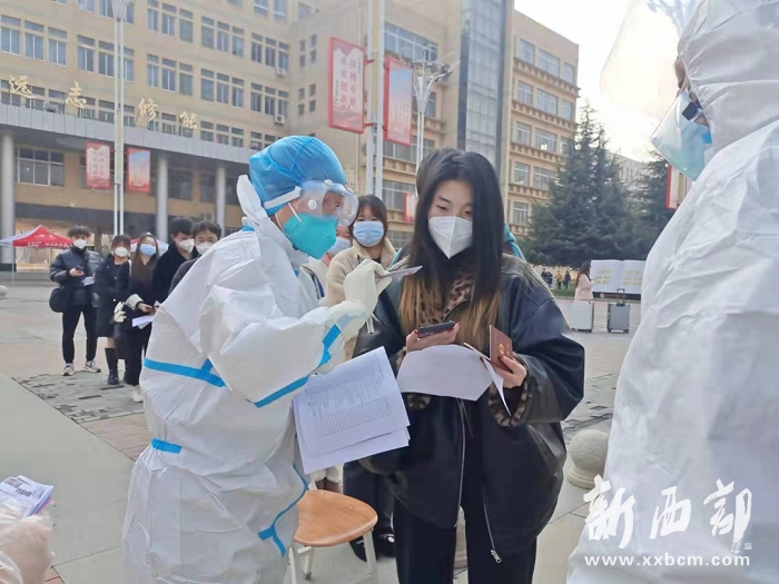 (靖邊縣疫情防控工作人員仔細核對學生的信息)
