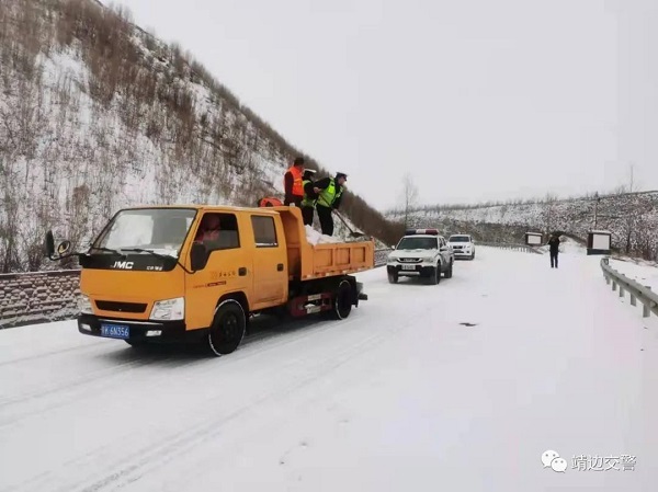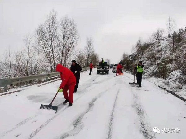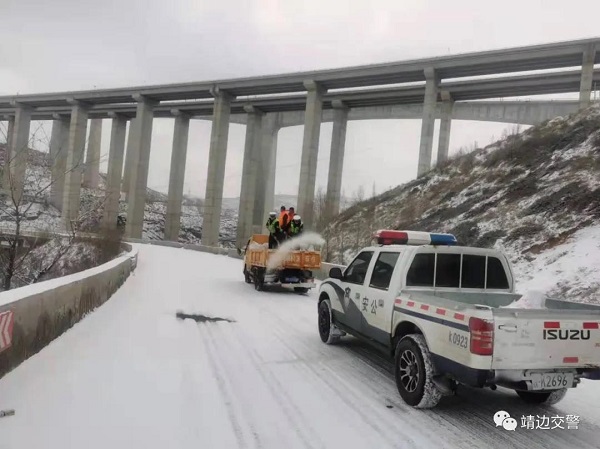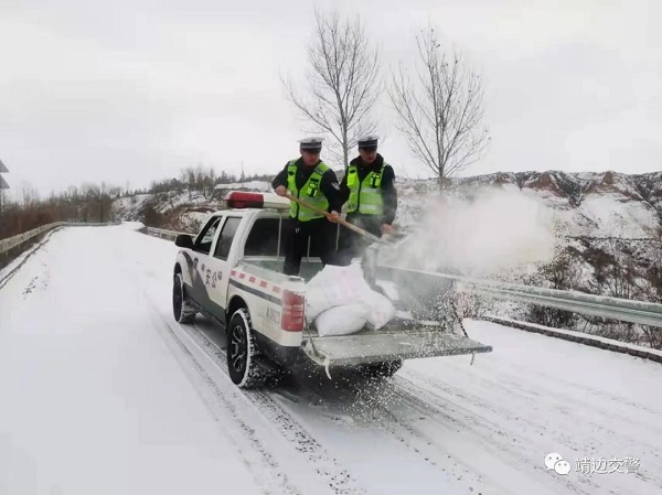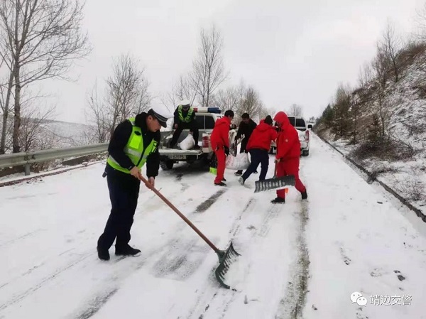 2月6日、7日連續(xù)兩日,我縣普降大雪,受降雪天氣影響,靖邊縣公安局交警大隊(duì)楊橋畔中隊(duì)所管轄區(qū)的賈家灣大橋、高家溝、大橋畔等道路的上坡、急彎等路段出現(xiàn)了結(jié)冰現(xiàn)象。為預(yù)防道路交通事故的發(fā)生,方便當(dāng)?shù)厝罕姷陌踩鲂校?日上午,楊橋畔中隊(duì)組織全體民警,積極聯(lián)合地方路政、當(dāng)?shù)卮逦?、采氣一廠等工作人員對易結(jié)冰濕滑路段進(jìn)行撒融雪劑化冰,齊心協(xié)力鏟除冰層,及時(shí)消除轄區(qū)內(nèi)的道路交通安全隱患。
