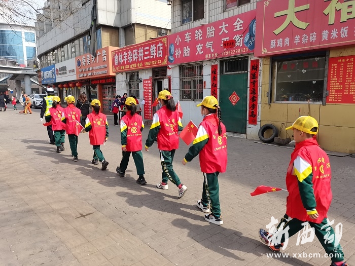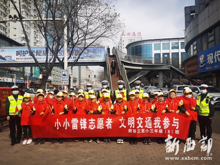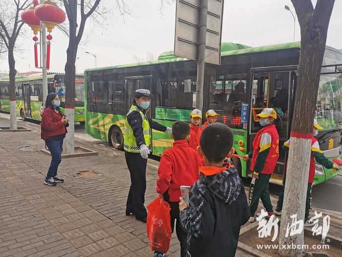 “家警?!绷x務護學隊,交警負責疏導校園周邊道路,指揮車輛即停即走,保障道路暢通;學生和家長負責引導同學們排隊乘公交、走人行天橋、按信號燈通行。同時,大家還結合“一盔一帶”安全守護行動,對橫穿馬路、不按人行道信號燈通行、騎乘電動車未戴安全頭盔等行為給予提醒與勸阻。