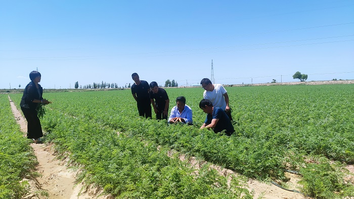大溝村塘馬瑤小組580畝的紅蘿卜地,遠(yuǎn)遠(yuǎn)望去,像一條條綠色“絲帶”鋪在褐色的土地上,映襯出一片豐收的景象。