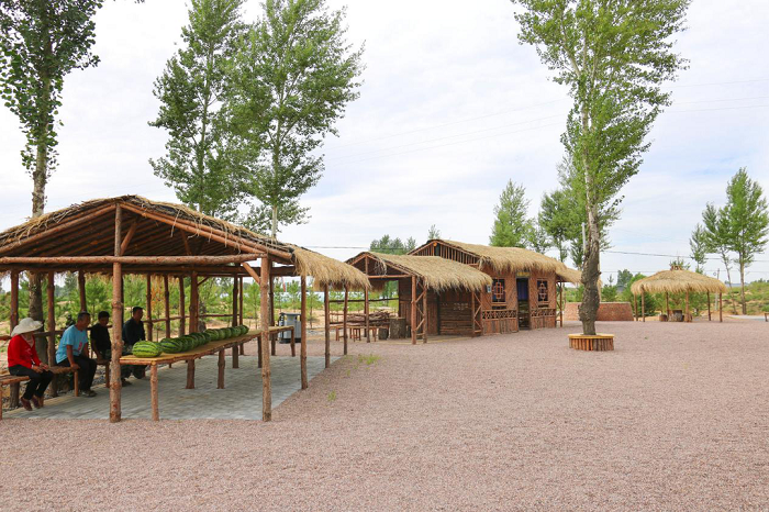 之前每到農(nóng)產(chǎn)品上市時(shí)節(jié),榆補(bǔ)路沿線經(jīng)常會(huì)看到群眾搭建的臨時(shí)草棚,隨意擺攤設(shè)點(diǎn)銷售香瓜、西瓜等農(nóng)產(chǎn)品,既影響環(huán)境,也存在重大安全隱患。為此,巴拉素鎮(zhèn)依托三場(chǎng)村、討討灘村、元大灘村黨建聯(lián)合體,在位于三個(gè)村中心節(jié)點(diǎn)的討討灘村建起了興農(nóng)驛站。驛站毗鄰榆補(bǔ)路,既是集農(nóng)特產(chǎn)品展銷、客商交流、餐飲購(gòu)物、打卡休憩于一體的綜合服務(wù)區(qū),也是當(dāng)?shù)厝罕娦蓍e娛樂的“口袋公園”。