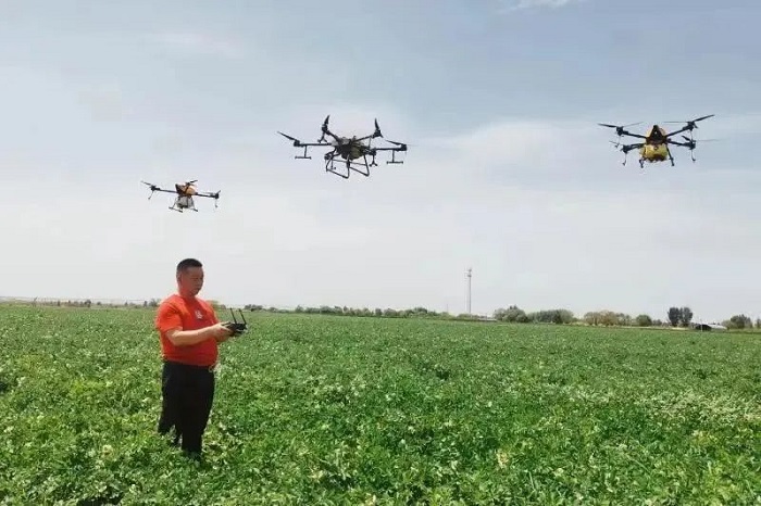 在補(bǔ)浪河鄉(xiāng)魏家峁村的玉米種植基地,思耀國正在和工作人員一起操作三架植保無人機(jī),為剛開花的馬鈴薯噴灑藥劑。思耀國2016年成立了榆陽區(qū)思路農(nóng)機(jī)農(nóng)民專業(yè)合作社,充分發(fā)揮社會化服務(wù)組織功能,為周邊鄉(xiāng)鎮(zhèn)農(nóng)民做好“耕、種、管、收、銷”等土地托管一條龍服務(wù),實(shí)現(xiàn)了農(nóng)業(yè)生產(chǎn)標(biāo)準(zhǔn)化,提高了生產(chǎn)效率和產(chǎn)出效益,開創(chuàng)了榆陽現(xiàn)代農(nóng)業(yè)數(shù)字化、智慧化的新模式,成為榆林市發(fā)展特色農(nóng)業(yè)的典型樣板,在鄉(xiāng)村振興中發(fā)揮著產(chǎn)業(yè)示范、帶動和引領(lǐng)作用。