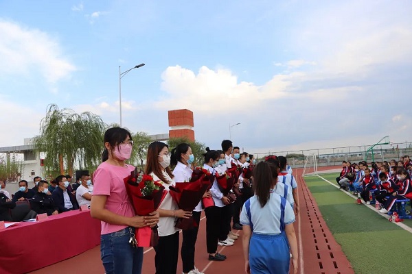 各班少先隊(duì)員代表為全校老師獻(xiàn)花。老師們接過鮮花,美麗的笑容在她們臉上綻放,幸福的感動(dòng)在他們心中流淌。
