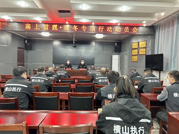 為貫徹落實榆林市中級人民法院執(zhí)行信訪工作推進會會議精神,全力化解群眾“急難愁盼”問題,12月16日下午,橫山法院召開“塞上雷霆·暖冬”專項行動動員會。黨組成員、副院長楊飛驥出席會議,執(zhí)行局長張海峰主持會議,全體執(zhí)行干警參加。