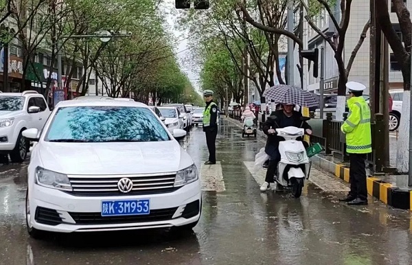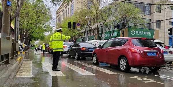 橫山交警大隊城區(qū)中隊民警在雨中護學(xué)