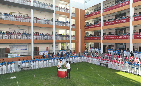 全體七八年級學(xué)生擊鼓送別學(xué)長學(xué)姐?!罢刮绎L(fēng)采,鑄我正氣,魅力一中,勇創(chuàng)奇跡”的口號響徹云霄。