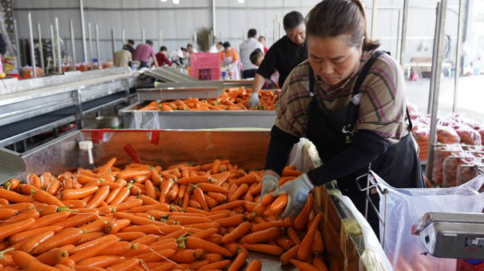 在陸家山村保鮮冷庫胡蘿卜加工車間內(nèi),一根根胡蘿卜被依次送上傳送帶,經(jīng)過清洗、分揀、打包等環(huán)節(jié),由冷鏈物流車運(yùn)往武漢、廣州等地。
