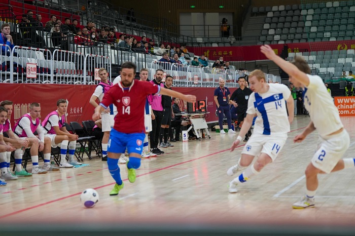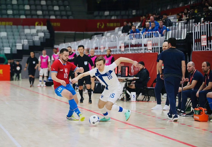 第二場比賽,中國隊迎戰(zhàn)斯洛伐克隊,現(xiàn)場吸引了眾多球迷入場觀賽、加油助威,氛圍達到頂峰。對決中,中國隊充分發(fā)揮反攻優(yōu)勢,在先失一球的情況下奮起直追,7分鐘時,中國隊5號凱賽爾在快速進攻中,抽射破門,將比分逼平。隨后中國隊17號陳智恒左路得球,小角度抽射得手,以2:1領先。在上半場即將結束時,斯洛伐克7號球員接隊友倒三角傳球?qū)⒈确职馄?,上半場?:2結束。