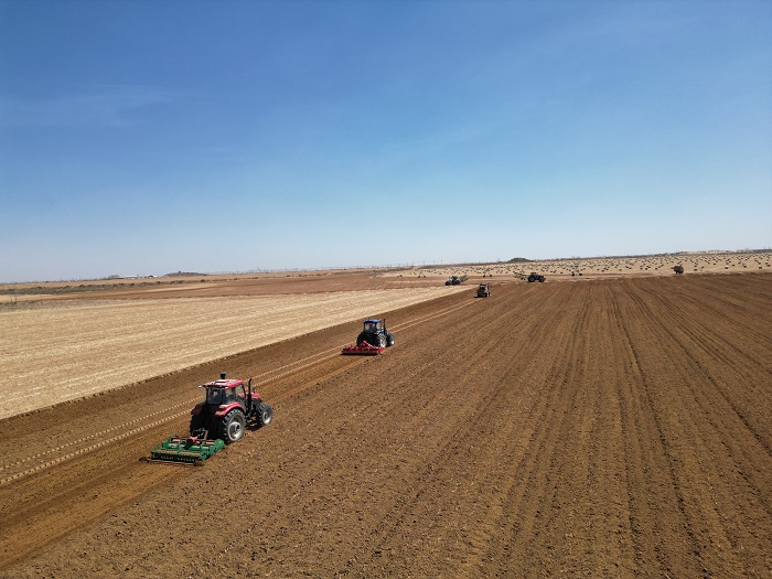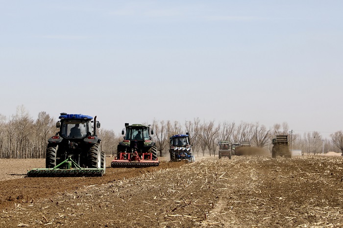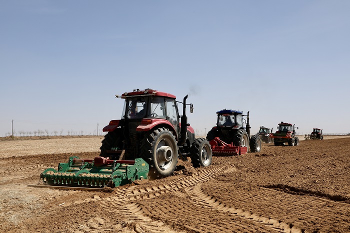 “我們現(xiàn)在主要做犁地、撒小麥籽、耙地等玉米播前的準備工作。撒小麥籽主要作用是防風固沙保護耕地。我們采用的是進口驅動耙,它對玉米播種起到速度快、精準高的作用,耙出來的地上實下虛,玉米在出苗的時候比較旺盛,出苗率達到99%以上。我們全部采用大馬力拖拉機,每臺拖拉機每天犁地達到250畝左右,耙地達到400畝?!睆姲l(fā)農機農民專業(yè)合作社負責人賀強說。