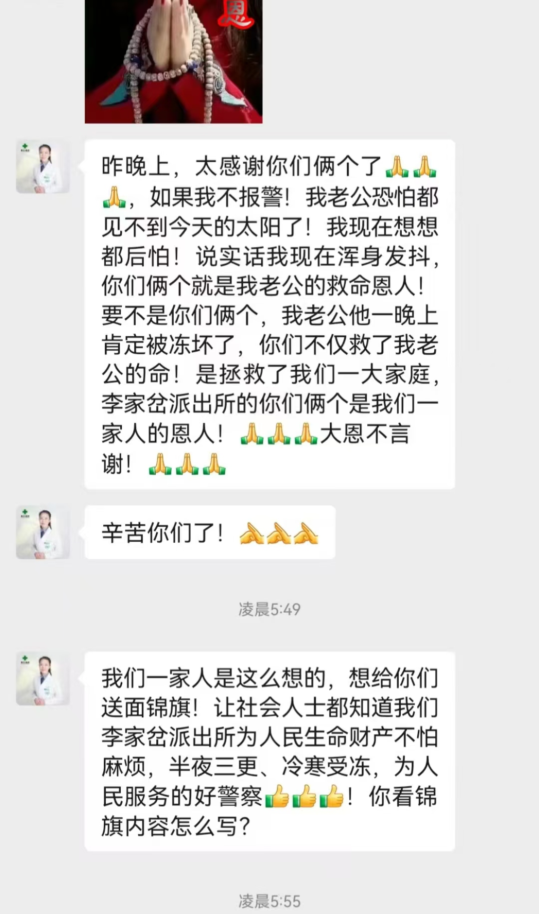 馬女士稱其丈夫王某某1點(diǎn)前給她打電話說他喝醉了,暈暈乎乎找不見回家的路了,讓妻子找他來。馬女士和孩子一塊順著回家的大小路口找了近1小時(shí)沒有發(fā)現(xiàn)丈夫的蹤跡?;艁y之下,怕丈夫出事,帶著孩子急忙趕到派出所求助,希望派出所幫忙找尋。得知情況后,派出所民警劉建生通過調(diào)取可能途徑的視頻監(jiān)控,沿著軌跡鎖定范圍,值班民警帶著馬女士母子二人駕駛警車立即前往,打著手電筒走街串巷摸排,歷經(jīng)倆個(gè)多小時(shí),在李家岔村一村民家的柴碳房的拐角處發(fā)現(xiàn)了王某某正蜷縮酣睡著,民警們與其家人喚醒呼呼大睡的王某某,通知家里人安全找到后,將其棉服穿戴整潔后,駕車將其一家人安全護(hù)送回家。凌晨五點(diǎn)多王某某的家屬微信上發(fā)來了感謝信,感激值班民輔警在嚴(yán)寒深夜不辭辛勞,無私付出。