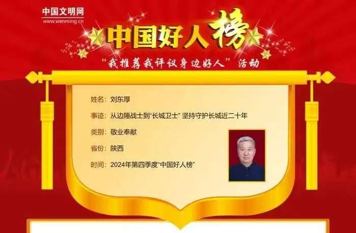1月15日,中央文明辦發(fā)布2024年第四季度“中國(guó)好人榜”。其中,府谷縣長(zhǎng)城保護(hù)工作站站長(zhǎng)劉東厚獲評(píng)敬業(yè)奉獻(xiàn)“中國(guó)好人”。